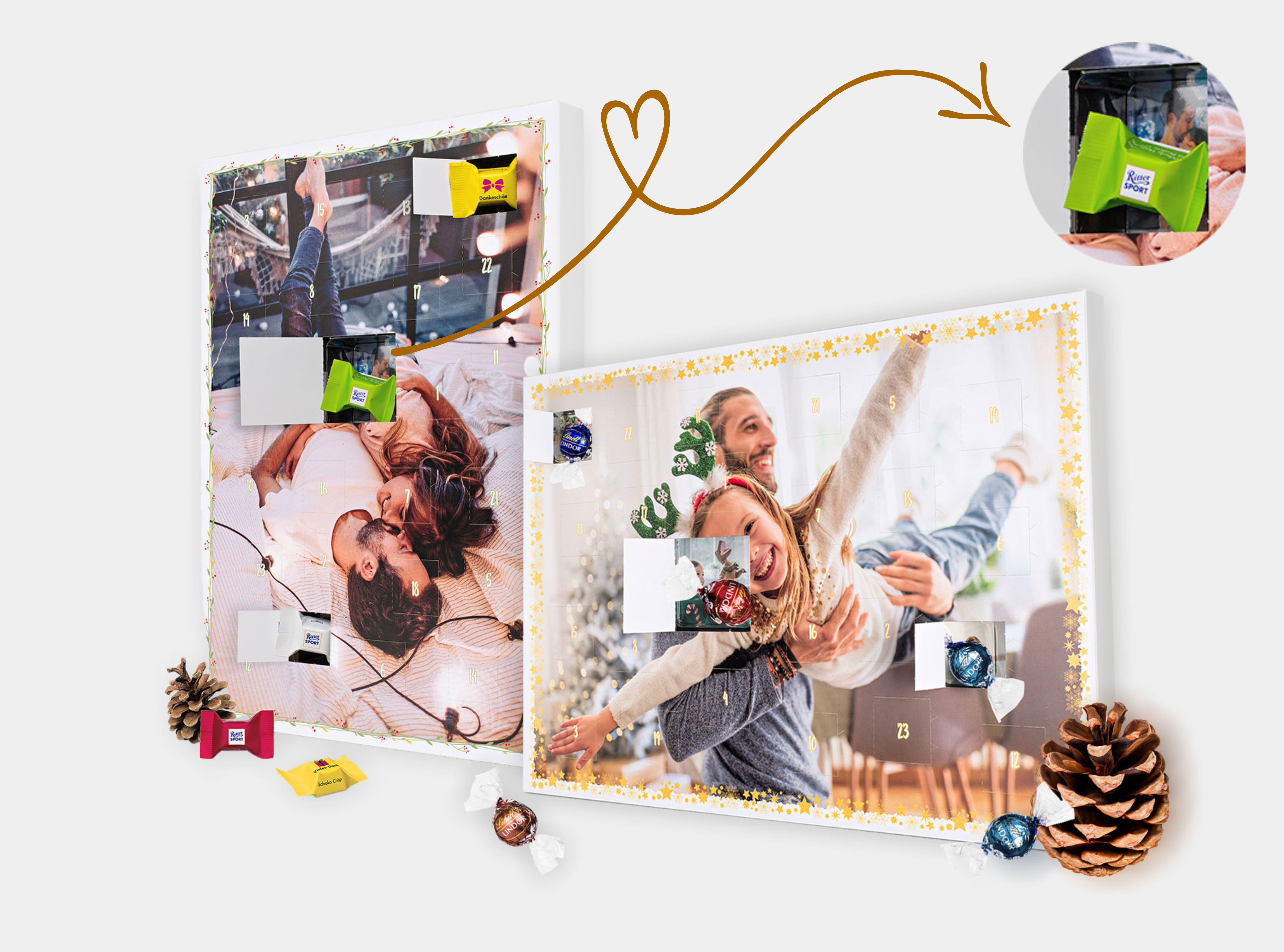 Hier gibt es alles: Dein persönliches Cover auf dem Foto, 24 Türchenbilder zum Selbstgestalten und leckere Schokolade. Das volle Programm!