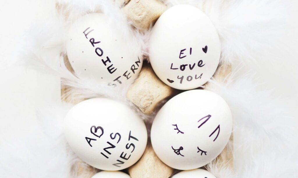Eine weitere Idee für diese coole Osterdeko ist das Beschriften der Eier. Ob mit positiven Begriffen, die man sich für sich und seine Liebsten wünscht, Namen oder auch Farbworten. Letzteres kommt besonders gut an, da es auf jeden Fall einen Lacher entlockt, wenn auf den schwarz-weißen Eiern die Worte Blau, Grün, Rot, Gelb stehen.